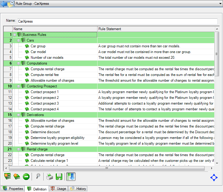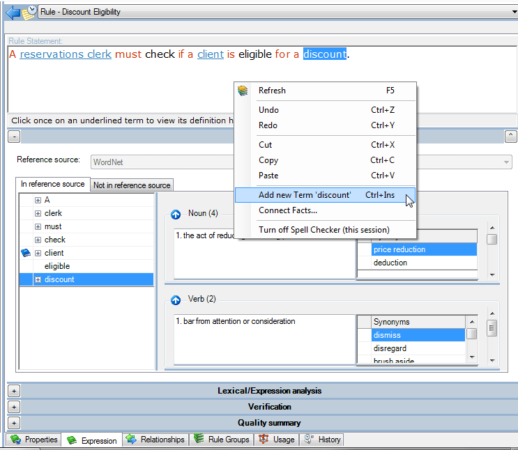 RuleXpress displays a list of the defined terms and the user can see and manage the definition of each. All referenced terms in a definition are automatically hyperlinked as they are typed. A usage tab shows recursively where a term is used so, for instance, one can see the rules that use a term then explore the terms that are used by those rules and so on. Terms can be words or phrases and can be disambiguated using a suffix. Users can define synonyms and identify which terms are preferred.