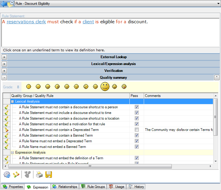 The tool really wants business people to use their own words. Quality rules exist and are applied to give each definition and rule a Quality Grade.