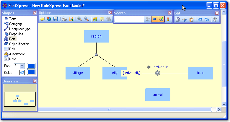 - The Search Box (next to the Options Box) allows you to search for terms or word phrases in the current diagram or the entire Fact Model.